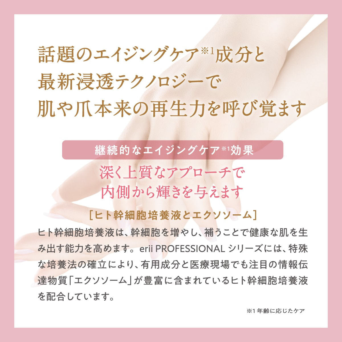 再生美容で注目されている「ヒト幹細胞培養エキス」をはじめ、肌専用に開発されたビタミンCと、